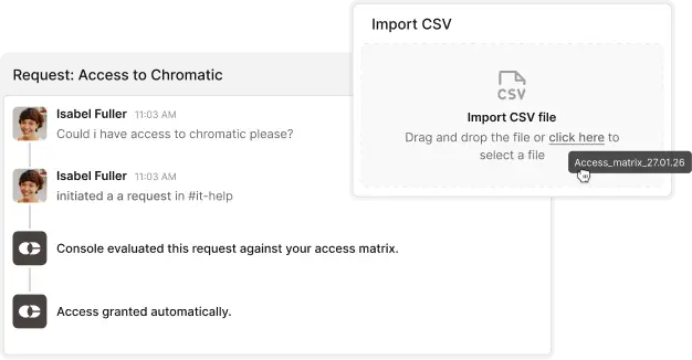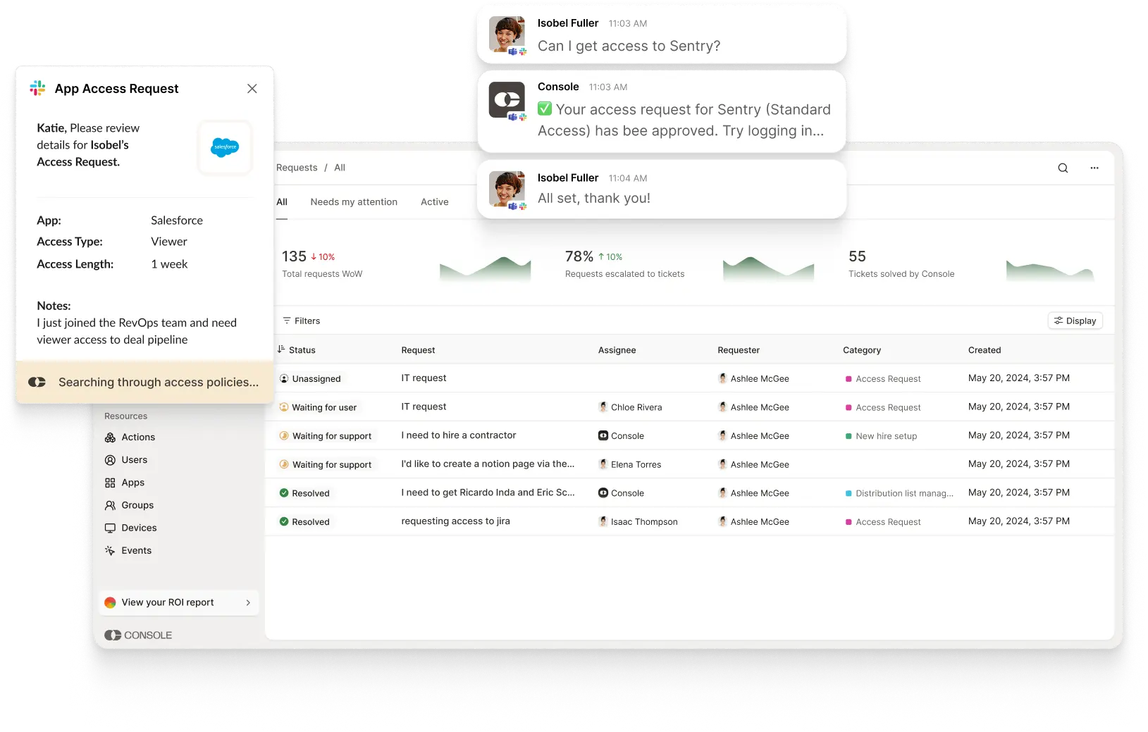 Employees ask for access in Slack or Teams. Console applies the right least-privilege policy, collects approvals if needed, provisions access, schedules automatic removal, and logs everything end-to-end.