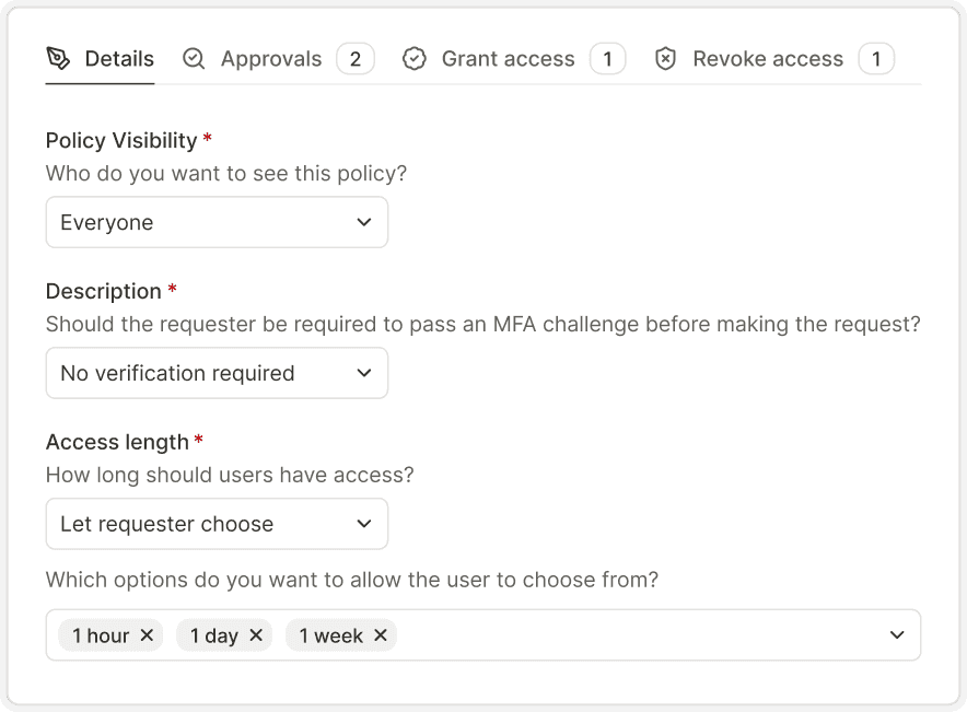Set who can request what, under which conditions, and for how long. Console enforces your policies everywhere automatically.
