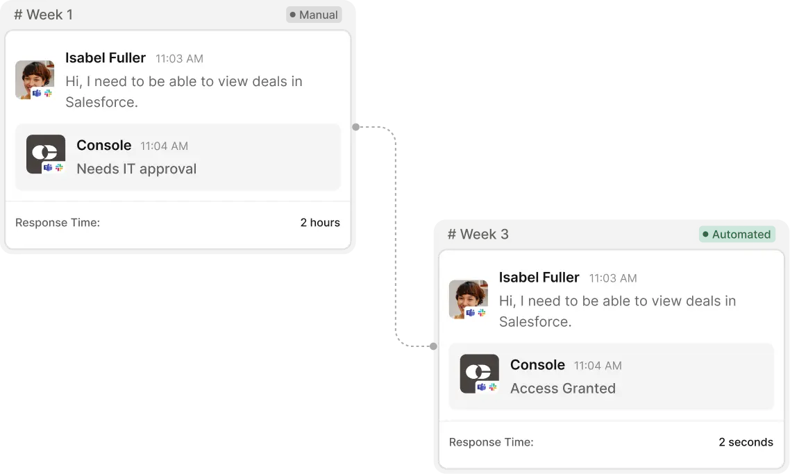 Employees message IT in Slack or Teams. Console understands the request, runs the right workflow, updates every system involved, and resolves it.
