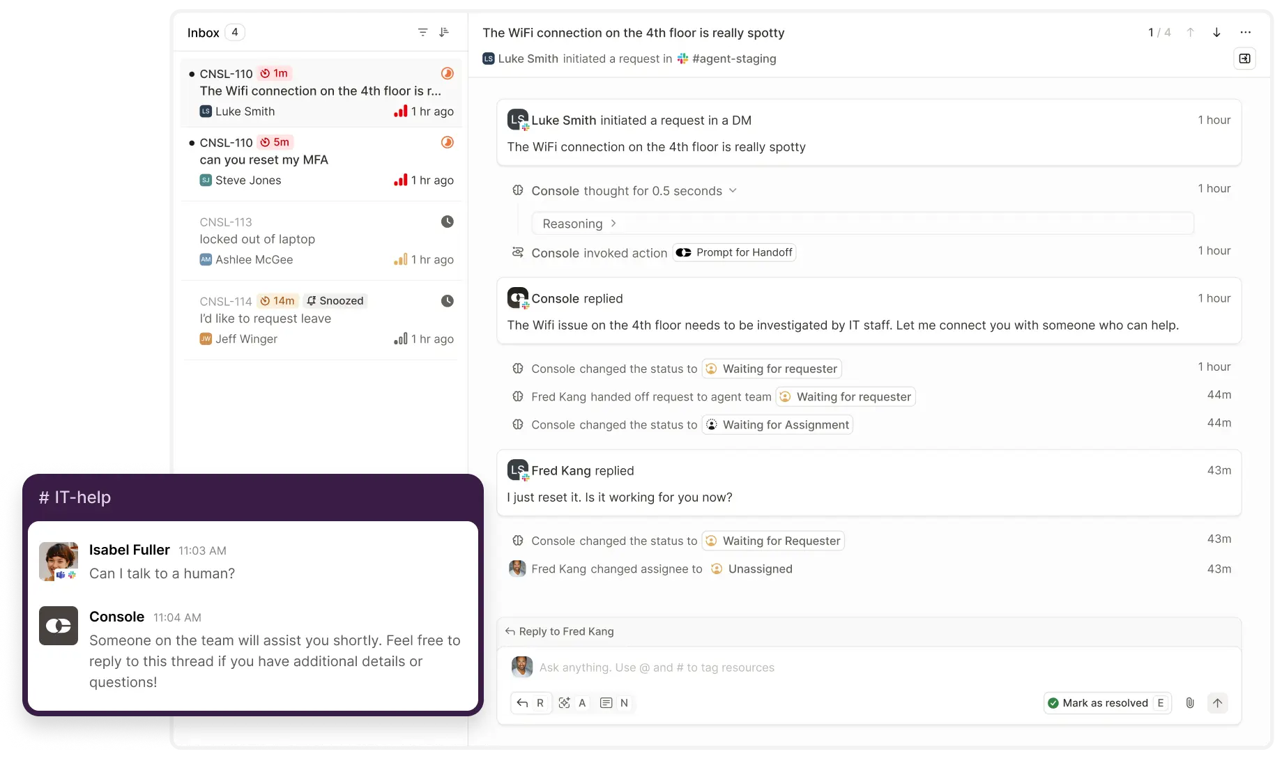 Most service desks stop at deflection. Console keeps improving by learning from how your team actually reviews, approves, and resolves work so automation coverage grows over time.