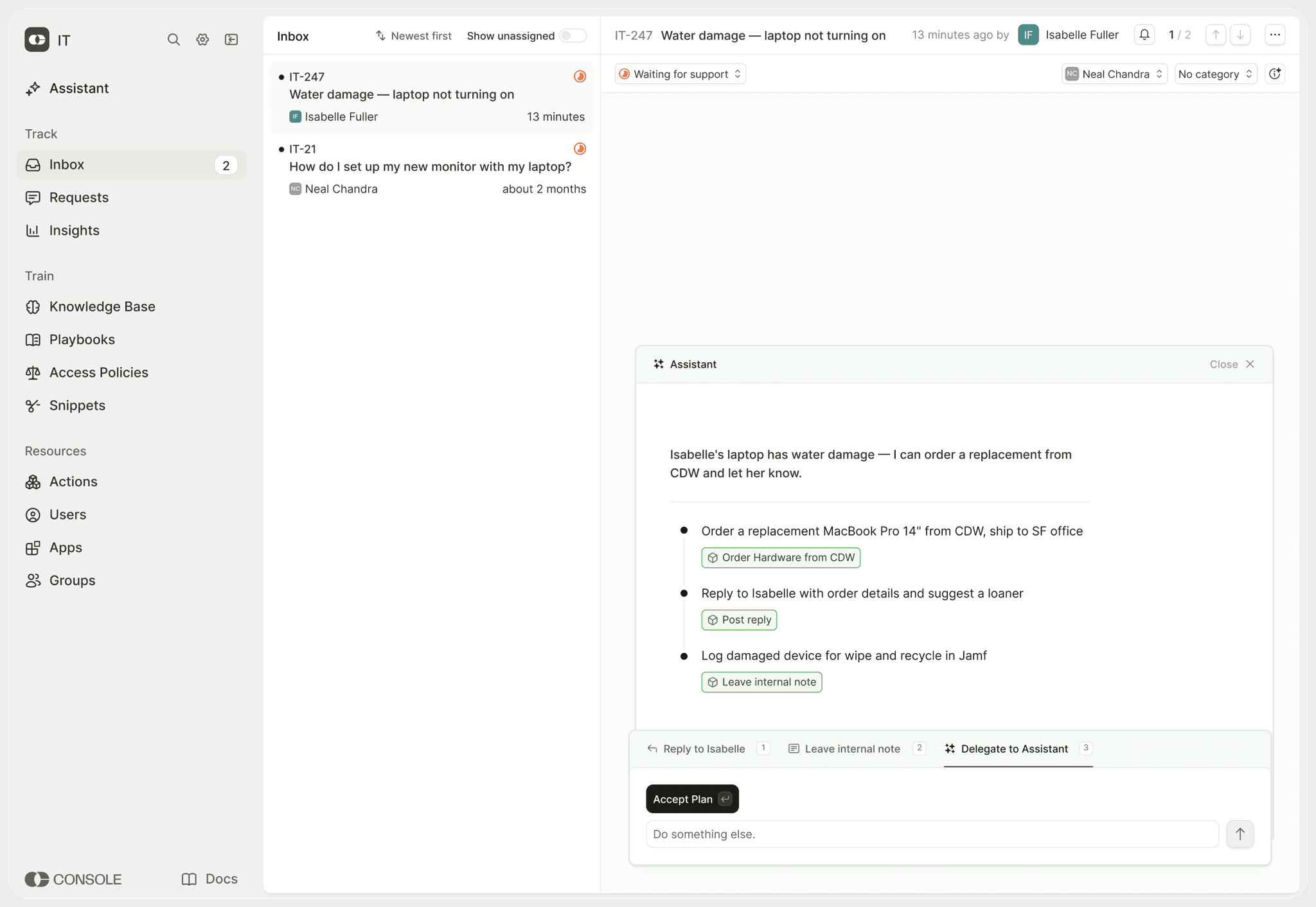 An AI agent built for Tier 2 work. Tell it what to build, ask what's missing, let it surface insights, and delegate requests directly from your Console workspace.