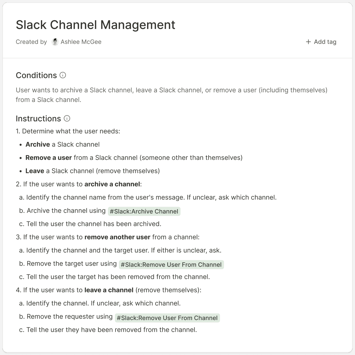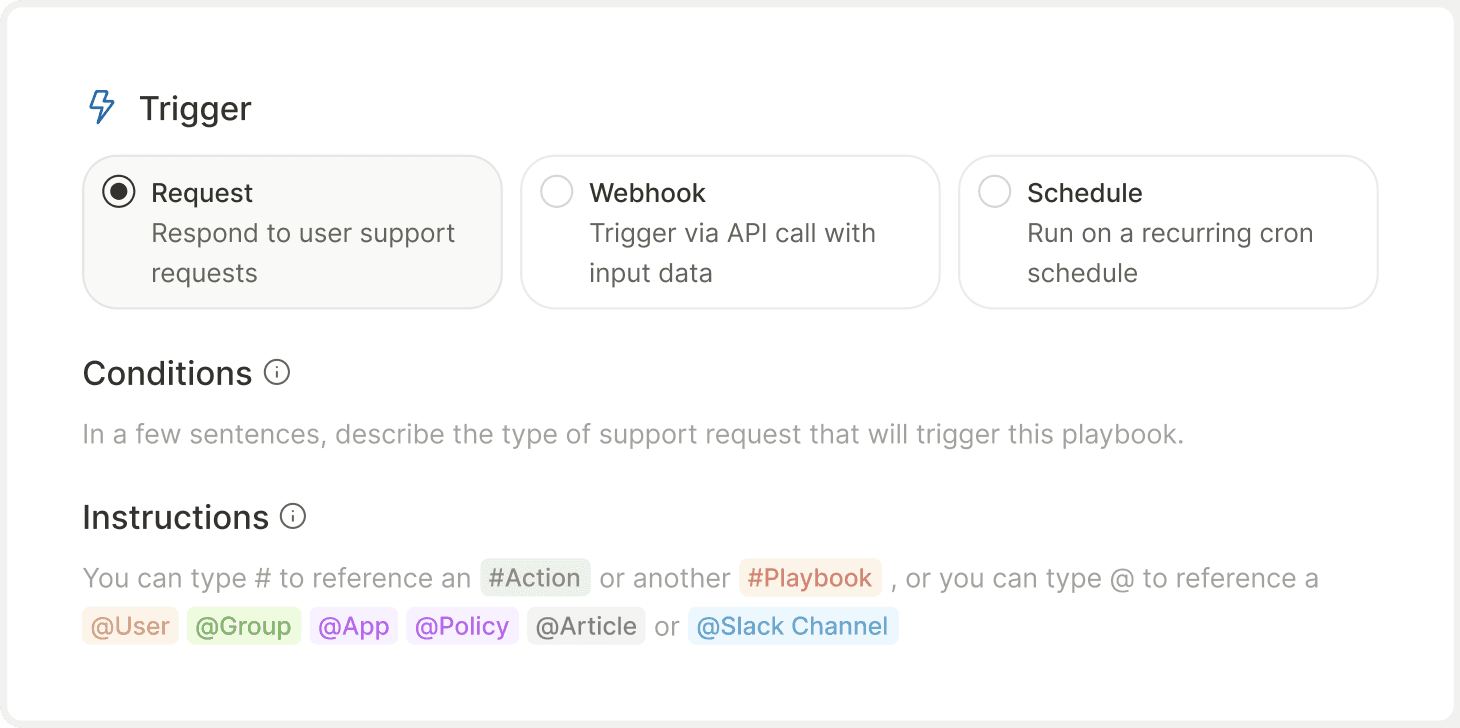 Define your outcomes in natural language and let Playbooks take coordinated actions across systems to to resolve requests and automate workflows.