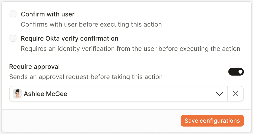 Apply granular controls at every step of an automation. Options include user confirmation before executing actions, Data Verify confirmation for identity verification, and security approval requests before taking actions.
